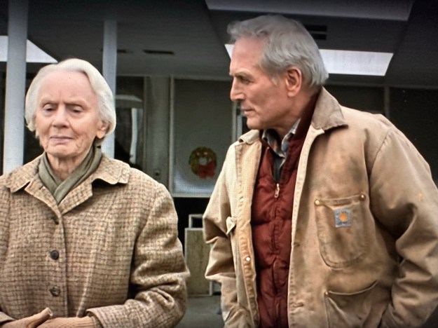 Jessica Tandy and Paul Newman. Photo of paused frame. Photo courtesy of Paramount Pictures. Newman donned a nylon-shelled puffer vest as an additional layer during the colder periods.